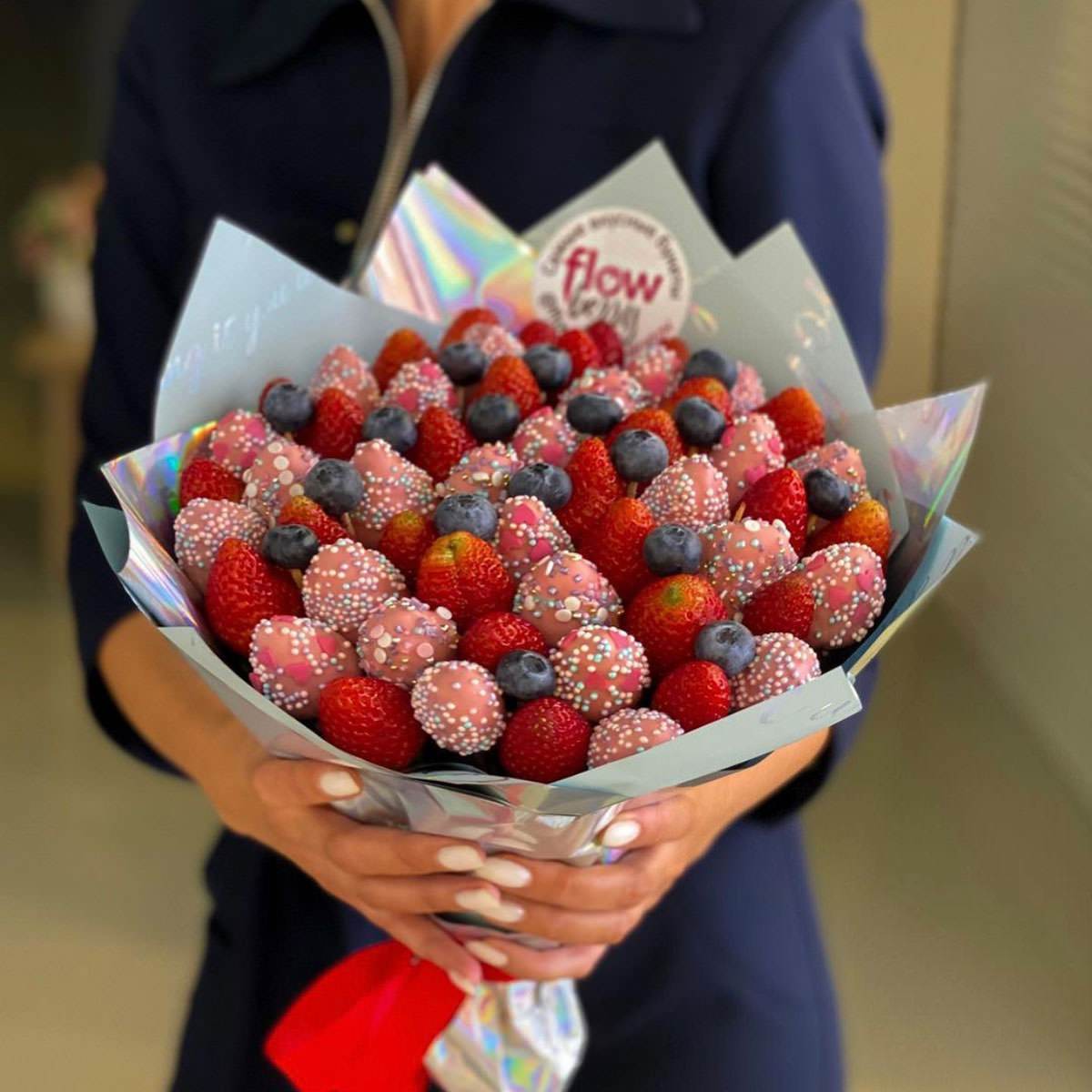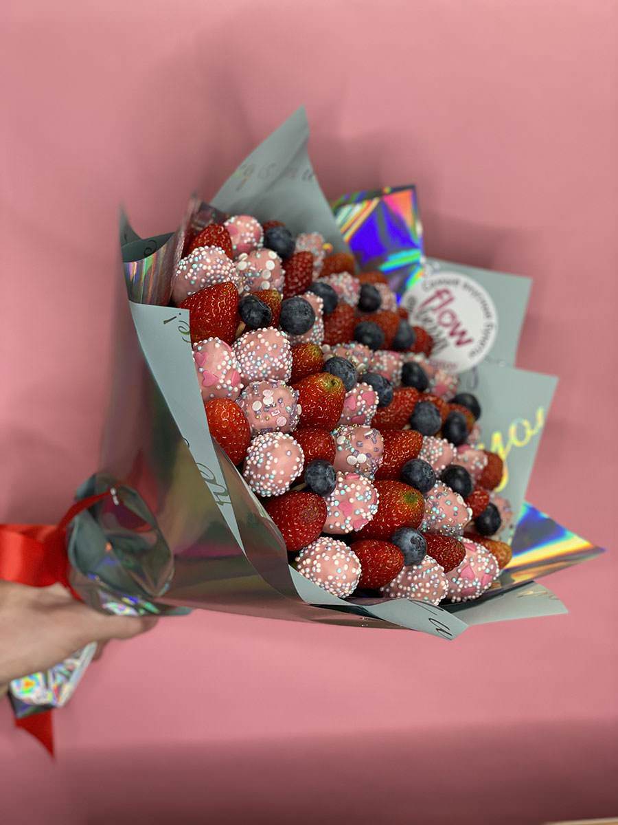Свежая клубника + клубника в бельгийском шоколаде марки — Callebaut в вашем букете. Для полноты вкуса и эстетики наши флористы добавили голубику, wow-эффект !