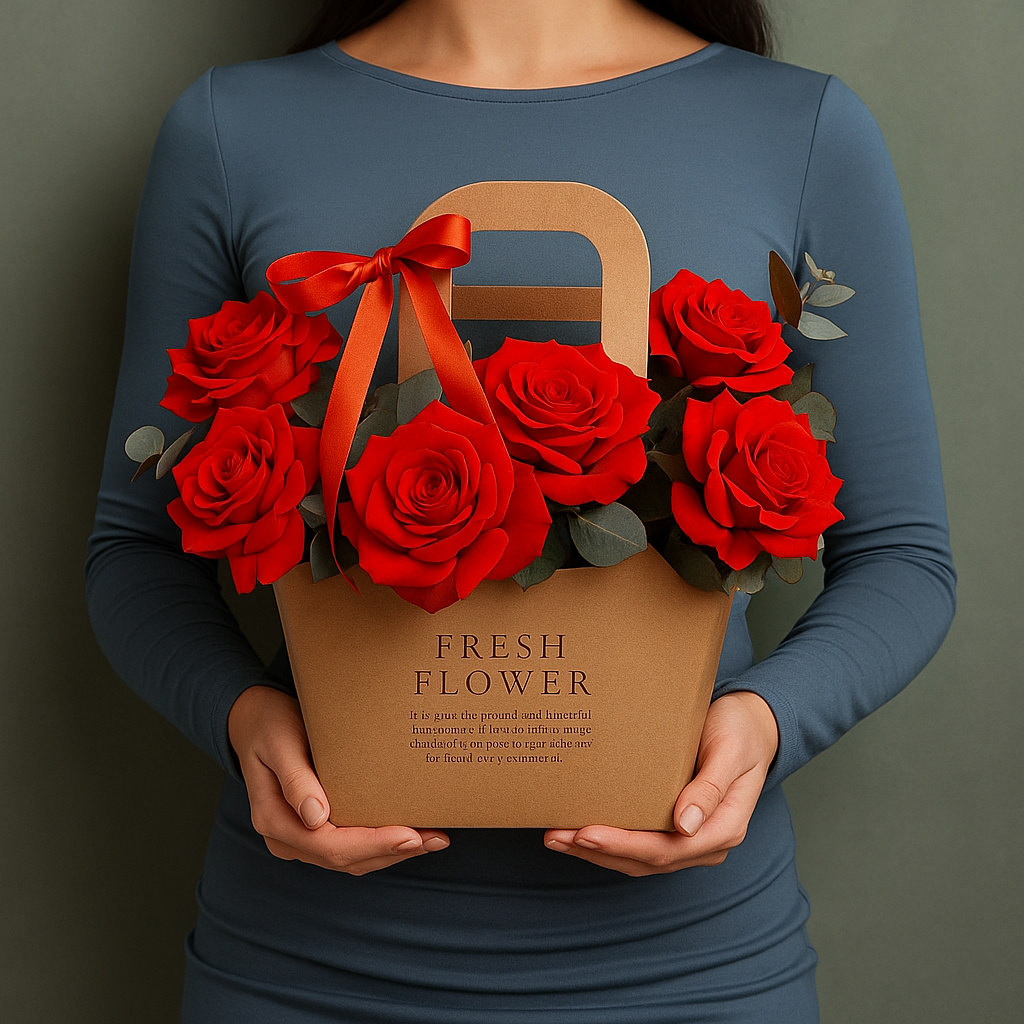 Роскошная композиция из алых роз в стильной крафтовой коробке — символ страсти и искренности. Подарок, который покорит сердце и запомнится надолго.