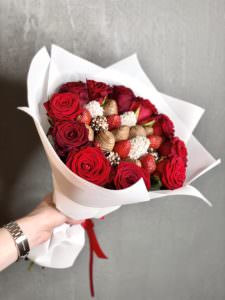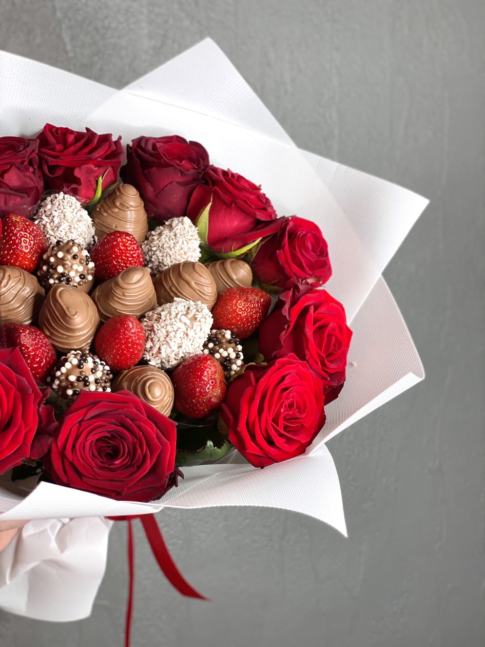 Очень качественный букет,жена в восторге. Шоколад настоящий, суперская клубника. Заказывал к 8 марта, отличная служба доставки. Однозначно рекомендую!